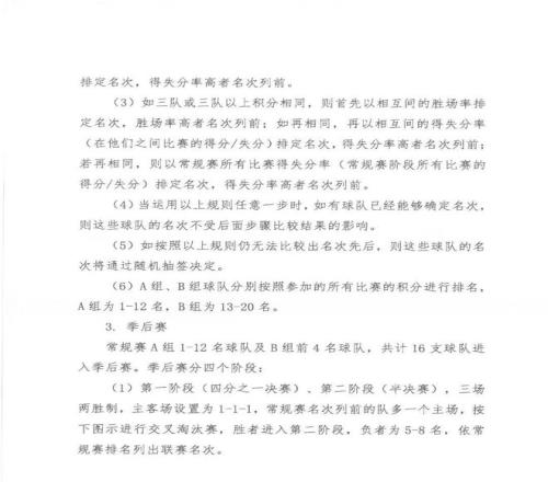 季后赛方面,常规赛A组1-12名球队及B组前4名球队,共计16支球队晋级。此处赛制有了不小变化,届时季后赛八强直接由常规赛前八名获得。