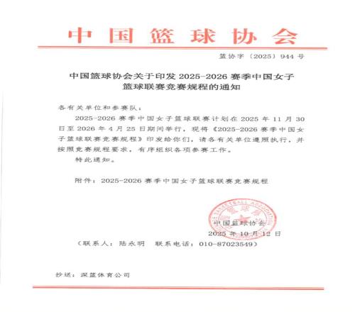 今天,中国篮协公布了2025-2026赛季中国女子篮球联赛竞赛规程。