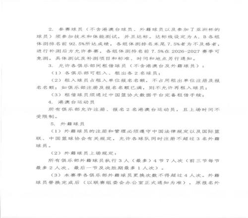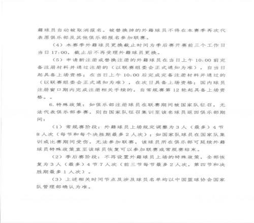 还有比较关注的外援政策,每支球队允许同时注册不超过3名外籍球员,上场则是4节7人次,前三节每节最多2人次、最后一节及决胜期最多1人次,至于更换次数不得超过4人次。