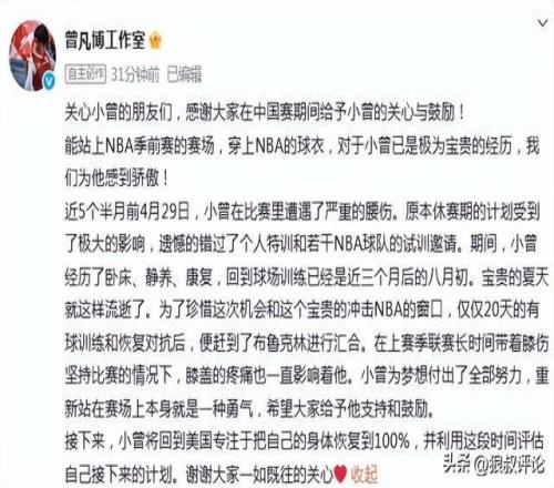 近5个半月前4月29日,小曾在比赛里遭遇了严重的腰伤。原本休赛期的计划受到了极大的影响,遗憾的错过了个人特训和若干NBA球队的试训邀请。期间,小曾经历了卧床、静养、康复,回到球场训练已经是近三个月后的八月初。宝贵的夏天就这样流逝了。为了珍惜这次机会和这个宝贵的冲击NBA的窗口,仅仅20天的有球训练和恢复对抗后,便赶到了布鲁克林进行汇合。在上赛季联赛长时间带着膝伤坚持比赛的情况下,膝盖的疼痛也一直影响着他。小曾为梦想付出了全部努力,重新站在赛场上本身就是一种勇气,希望大家给予他支持和鼓励。