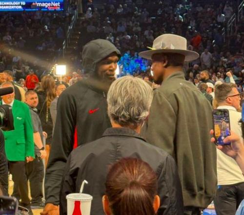 前雷霆球员伊巴卡也是来到现场见证这一时刻,还在赛前与前队友杜兰特进行寒暄,后者目前效力于火箭。