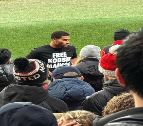 然而,让球迷郁闷的还不只是比分。比赛当晚,科比·梅努的哥哥乔丹·梅努现身老特拉福德,却被拍到身穿一件黑色T恤,上面用极简字体印着一句直白口号: “放梅努离队(Free Kobbie Mainoo)。”